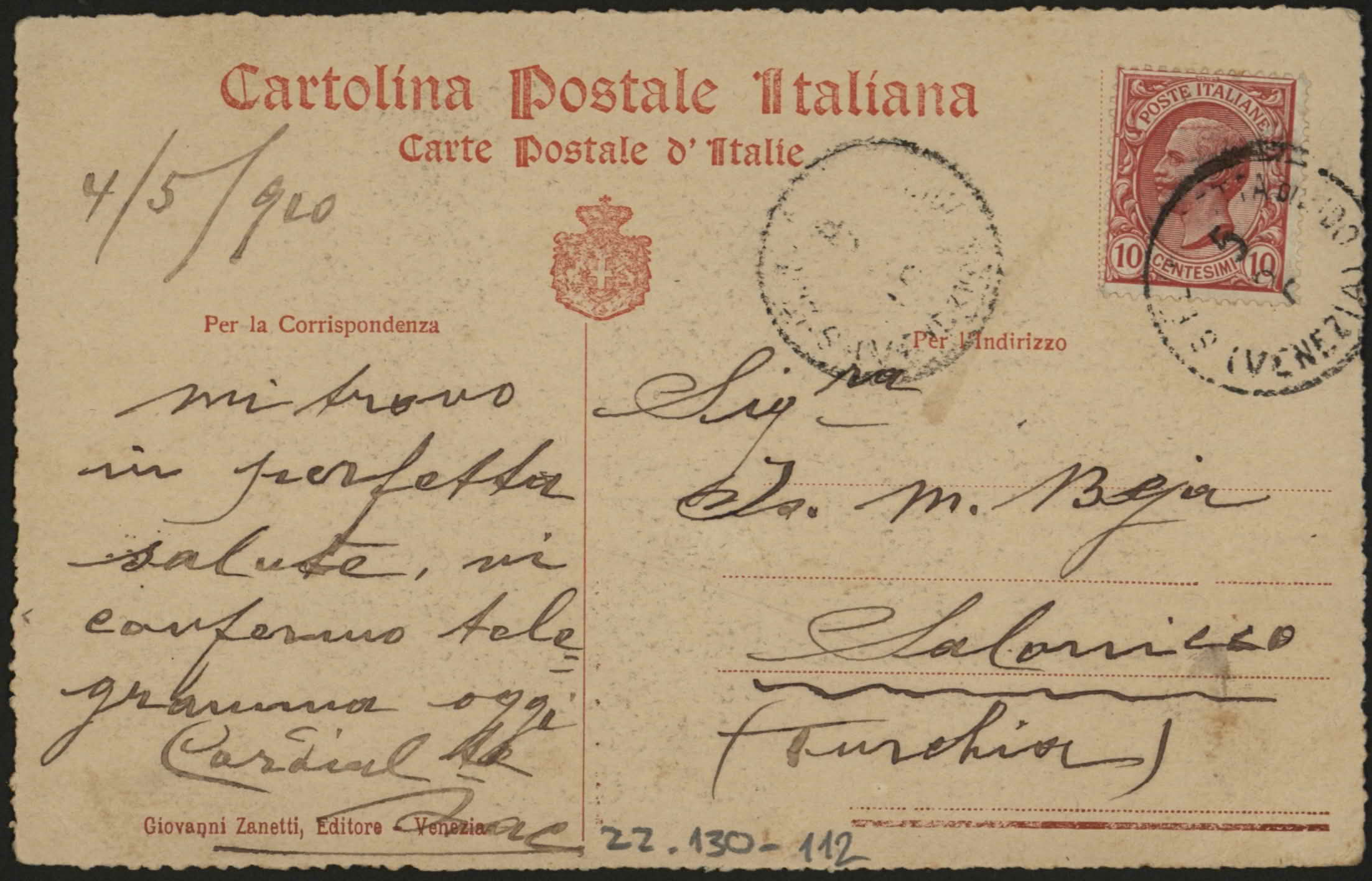 From Marie Therese Robbe to Madmoiselle Lucie Beja chez Monsieur Is. M. Beja, Salonique, Turquie. "Je vous embrasse, Marie Therese Robbe".