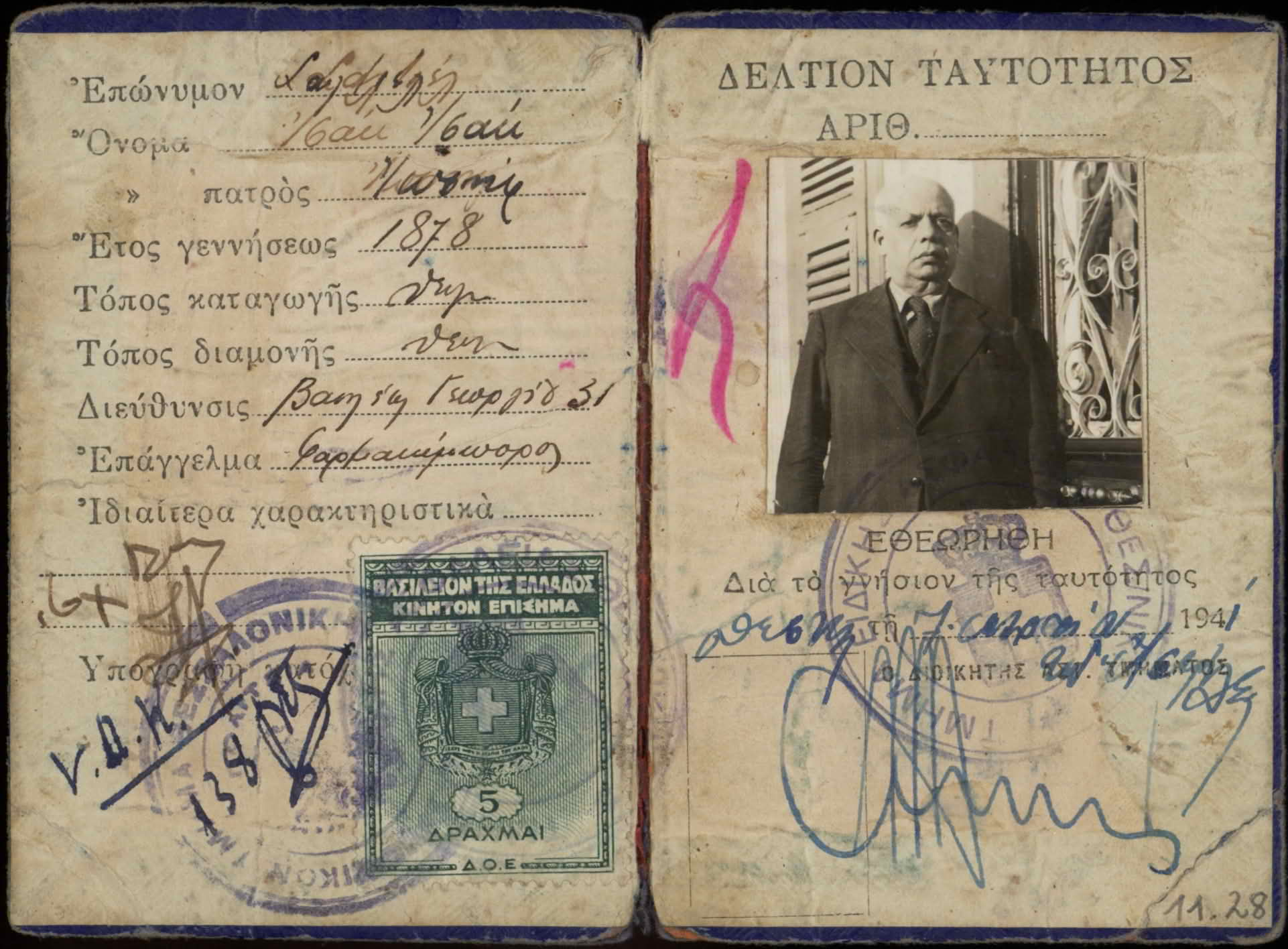 Identity card, issued for Isaac Joseph Saltiel by the Greek Police of Thessaloniki.