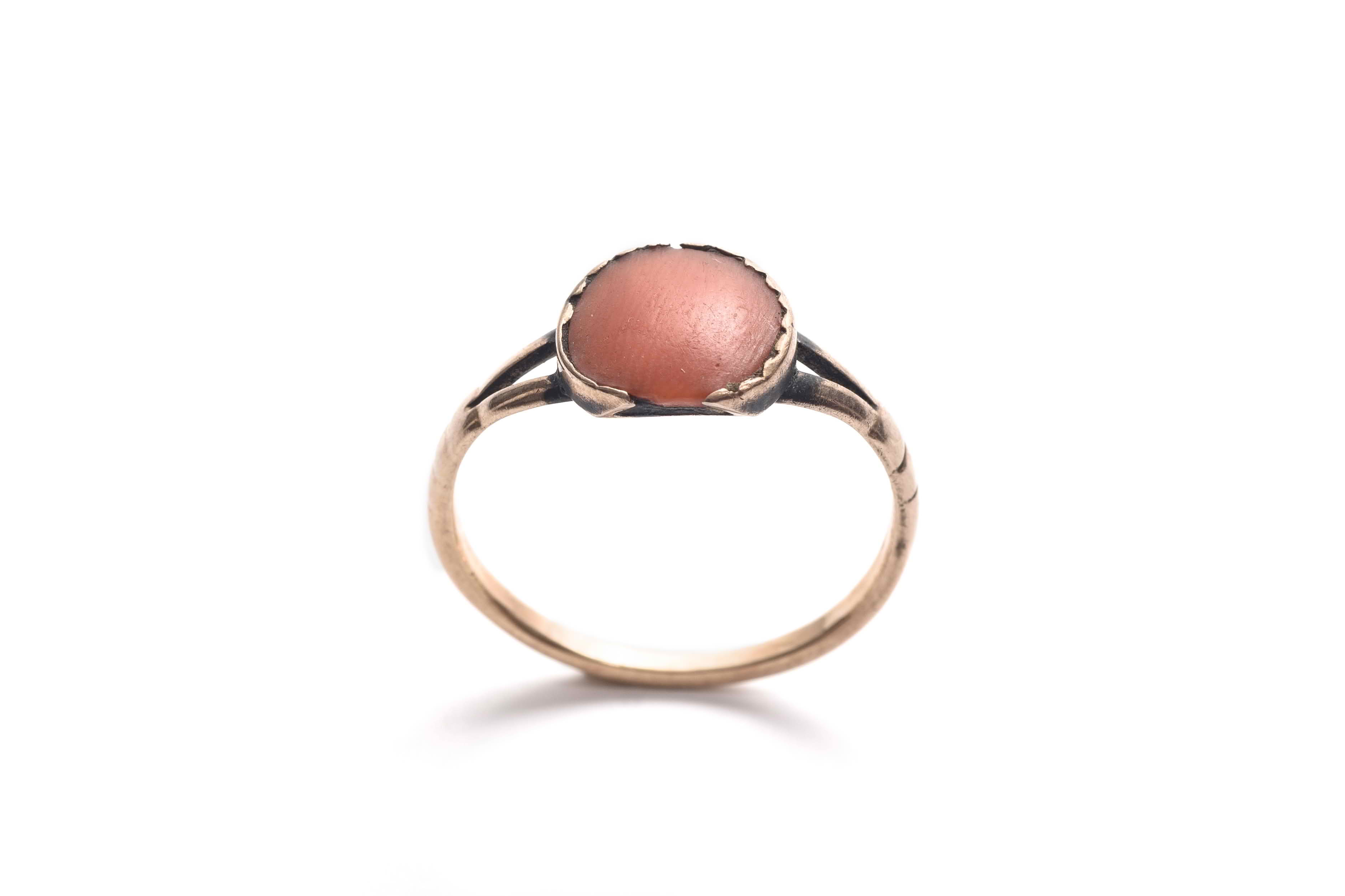 Woman's gold ring, round bezel (broken piece) set with coral, split shoulders.