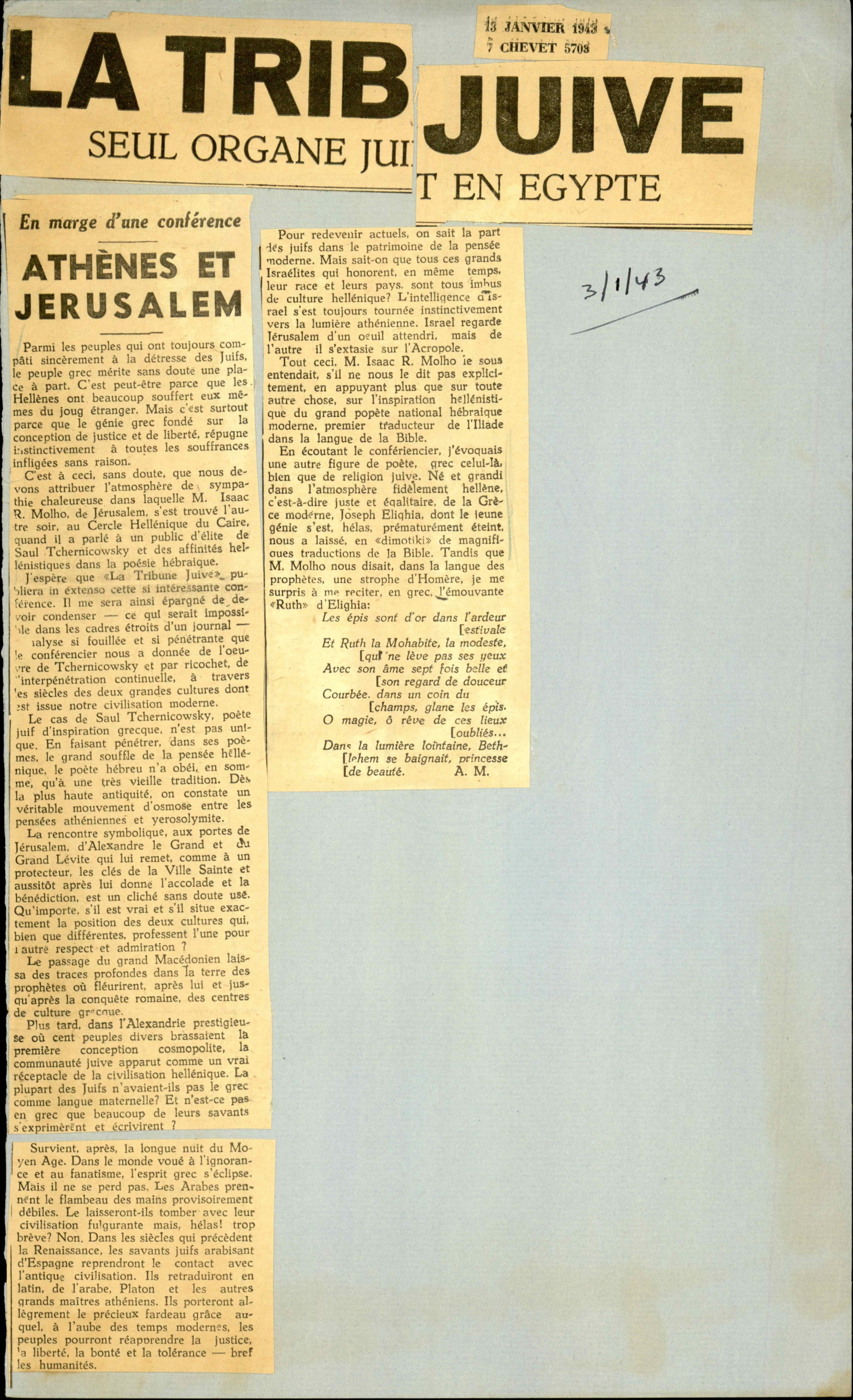 "La Tribune Juive" newspaper clippings, attached on paper, with article titled "En marge d'une conférence: Athènes et Jérusalem" by A.L. Molho, January 13th, 1943.